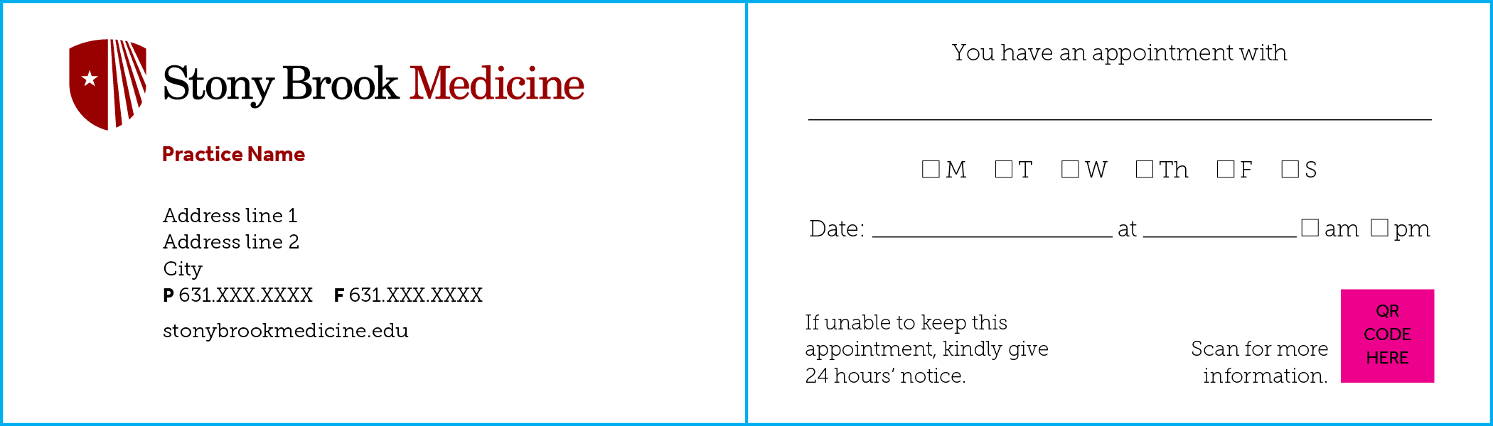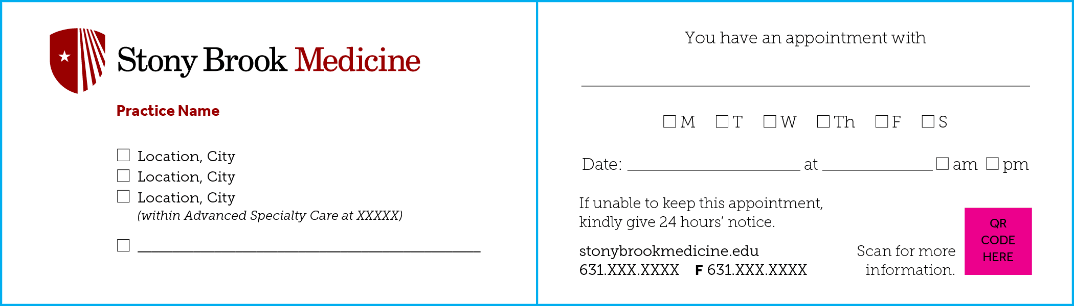 Practice information cards may be ordered using the form below. Please note the form will download as a fillable PDF that can either be emailed, faxed or sent via-interoffice to the Stony Brook University Hospital Print Shop.