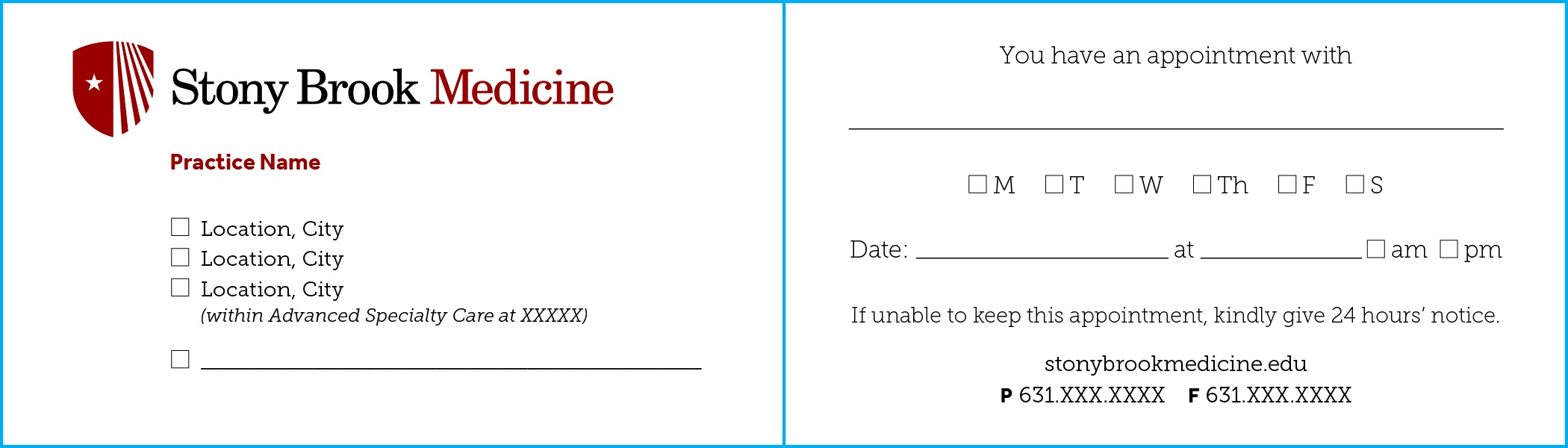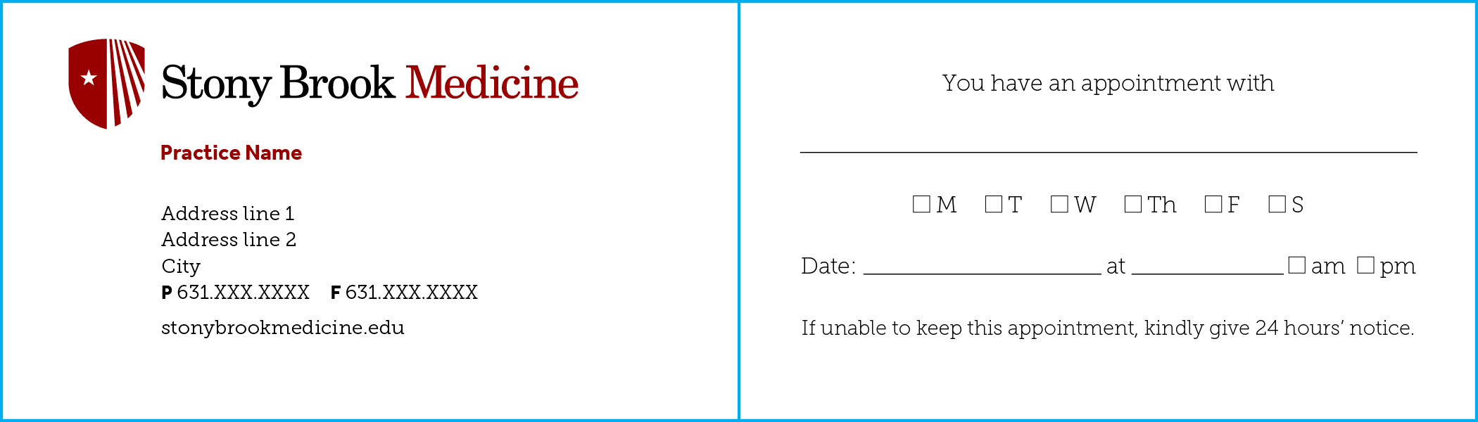 Business and appointment cards may be ordered using the forms below. Please note once you select which form you need, it will download as a fillable PDF that can either be emailed, faxed or sent via-interoffice to the Stony Brook University Hospital Print Shop. Examples of each type of card are also below for reference.