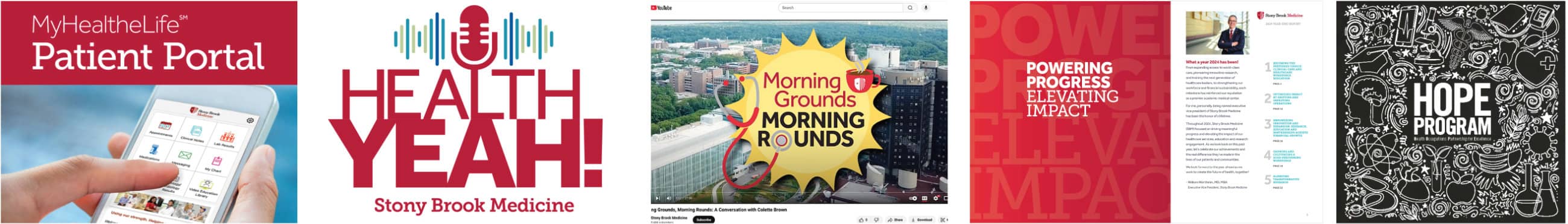 Examples show creative brand font styling for Stony Brook Medicine’s digital, video, print and apparel marketing.